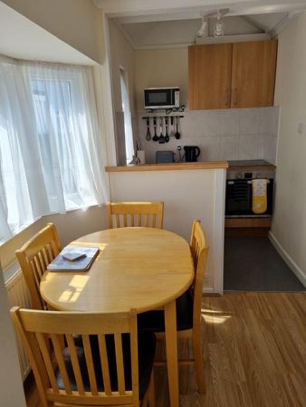 The back-door steps from the lounge go out to the private enclosed garden patio area with a bench table and chair. Ideal for BBQs. The kitchen has modern electric appliances including oven, hob, microwave, toaster and kettle.